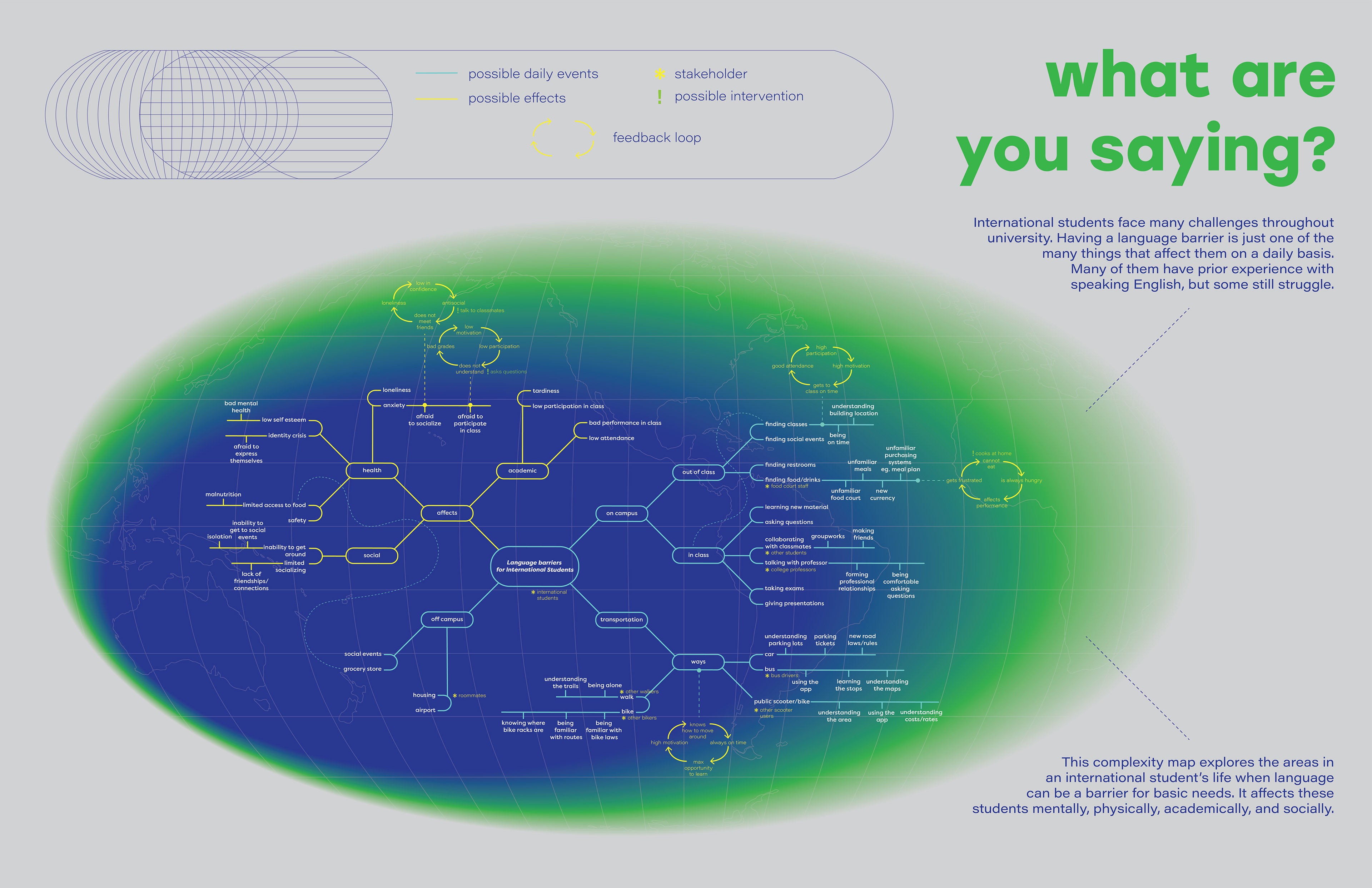 This complexity map was created after a research phase, and explains the different areas in an international student's everyday life where language pose a problem.